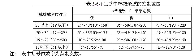 3.生條棉結(jié)雜質(zhì) 反映了每克生條中所含的棉結(jié)雜質(zhì)粒數(shù),該指標(biāo)由企業(yè)根據(jù)產(chǎn)品要求自定,其參考范圍見(jiàn)表3-6-1。