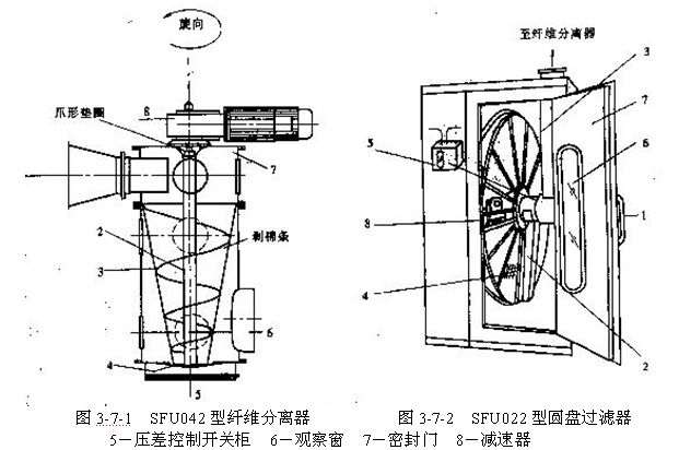 (1)纖維分離器和粉塵緊壓器  纖維分離器的作用是收集和壓縮塵流中的纖維和雜質(zhì)。結(jié)構(gòu)如圖3-7-1所示。含纖維塵流由入口1進(jìn)入纖維分離器,