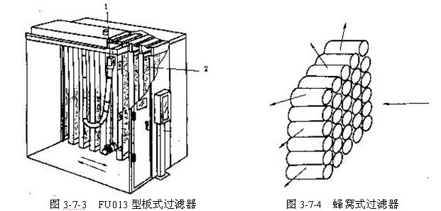 (3)板式過濾器  板式過濾器主要用于過濾細(xì)小的粉塵,主要作為第二級過濾設(shè)備。它與纖維分離器,圓盤式過濾器可組成了二級過濾系統(tǒng)。與集塵器組合,可直接用于回風(fēng)過濾。板式過濾器的結(jié)構(gòu)結(jié)圖3-7-3所示.。為了在一定空間具有較大的過