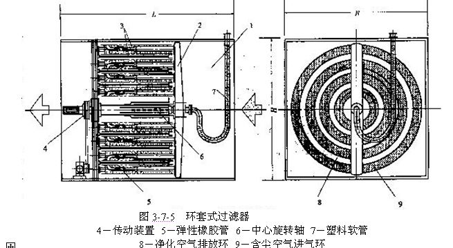 (5)環(huán)套式過濾器  如圖3-7-5所示,環(huán)套式過濾器也屬于第二級過濾器,由四組八只直經(jīng)大小不同的圓籠過濾單體以同心環(huán)套的方式組裝而成,由一級過濾器排入的含粉塵空氣分別進(jìn)入大小不同的圓籠形成的過濾單體3,在通過內(nèi)外濾籠時(shí),將粉塵阻留在長毛絨濾料上,而排出凈化空氣。在長軸絲杠的驅(qū)動下,梳篦式吸嘴2既旋轉(zhuǎn)又往復(fù)運(yùn)動,清吸掉附著在濾料上的粉塵,經(jīng)粉塵緊壓器壓實(shí)成塊狀后收集。分離后的空氣被再排回濾塵箱體內(nèi)過濾。