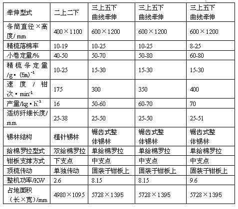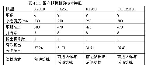 1958年上海國棉二廠參照國外精梳機,設計制造了我國第一臺精梳機,命名為紅旗牌精梳機。20世紀60年代初期,研制了A201型及A201A型精梳機,車速為116鉗次/分,從而結(jié)束了我國不能生產(chǎn)精梳機的歷史。到了20世紀70年代,針對A201A型精梳機分離羅拉傳動機構(gòu)中存在的磨損大、振動大等問題進行了改進,出現(xiàn)了A201B型精梳機;之后將A201B型精梳機的單筒雙條改為雙筒單條及分離羅拉傳動機構(gòu)的改進,更名為A201C型精梳機,車速為145鉗次/分。20世紀70年代末,通過對引進設備的消化吸收,于80年代初研制開發(fā)了FA251型精梳機,車速為180鉗次/分。同時又對A201C型精梳機進行了多項改進,設計制造了A201D型精梳機,車速為165鉗次/分。20世紀90年代初,上海紡織機械總廠對FA251型精梳機進行了八項技術改進,發(fā)展成為FA251B型精梳機,車速達到180鉗次/分。1991年到1993年相繼開發(fā)了FA261型、SXFA252型精梳機,車速為300鉗次/分。到了1998年以后以相繼開發(fā)了PX2、FA266、F1268、SXF1269型精梳機,精梳機的速度提高到350鉗次/分,到2002年我國以開發(fā)了SXF1269A、F1268A、FA269型精梳機,最高車速達到了400鉗次/分;我國精梳機的加工制造水平與世界先進水平的差距正在縮小。幾種國產(chǎn)精梳機的技術特征見表4-1-1。