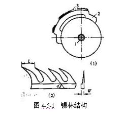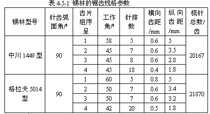 鋸齒式整體錫林的結(jié)構(gòu)如圖4-5-1所示,它是由錫林軸1、錫林體(或稱為弓形板)2和鋸齒梳針3組成,鋸齒的形狀如圖4-5-1所示,SXF1269A型精梳機的錫林直徑為125.4mm。錫林體與錫林軸由緊固螺釘連成一體,軸與錫林體的相對位置可作相對調(diào)整。在錫林體的四分之一表面粘接有金屬鋸齒,可分為一分割、二分割、三分割、四分割及五分割五種,可根據(jù)紡紗質(zhì)量要求選定;從而形成前稀后密、不同規(guī)格參數(shù)鋸齒排列的錫林針面。幾種不同整體錫林的鋸齒規(guī)格參數(shù)見表4-5-1。
