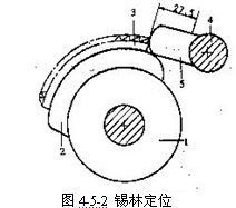 錫林定位的方法是:如圖4-5-2所示,(1)松開錫林體的夾緊螺釘,使其能與錫林軸相對轉(zhuǎn)動。(2)利用錫林專用定規(guī)5的一側(cè)緊靠分離羅拉表面,定規(guī)5的另一側(cè)與錫林的鋸齒3相接。(3)轉(zhuǎn)動錫林軸,使分度盤指針對準設定的分度數(shù)。SXF1269A型精梳機的錫林定位是在37-38分度。