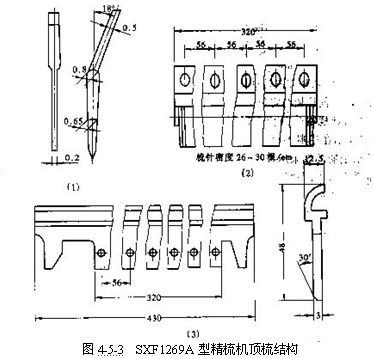 3、頂梳的植針規(guī)格    頂梳的植針規(guī)格包括:針號和針密等,它對梳理作用有著重要影響。梳針的密度應控制在使喂入纖維層中最小的棉結(jié)、雜質(zhì)和短纖維被阻留在頂梳的后面;植針密度越大,阻留棉結(jié)雜質(zhì)的效果越好。如果密度過大,纖維與梳針之間的壓力增大而使摩擦阻力過大,將使纖維受力過大而被拉斷或?qū)⑹後槻饠。精梳機的頂梳植針密度一般為26根/cm,紡紗持量要求高時,也可采用28根/cm或30根/cm。