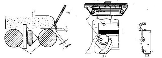 SXF1269A型精梳機頂梳的結(jié)構(gòu)如圖4-5-3所示。頂梳用特制的彈簧卡固裝于上鉗板上,并隨之一起運動。圖(甲)頂梳梳針結(jié)構(gòu);圖(乙)為針板結(jié)構(gòu),頂梳梳針植于其上,頂梳梳針與針板的夾為180,以使梳針更有效地梳理纖維;圖(丙)為頂梳托腳,用鋁合金制成,針板置于其上。