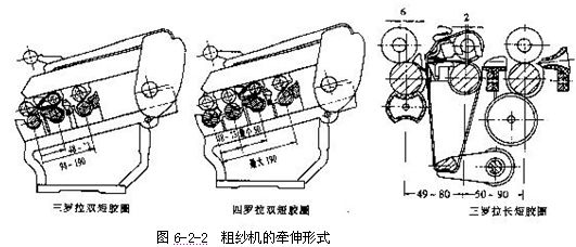 (一)粗紗機(jī)的牽伸型式  須條從喇叭口出來(lái),即進(jìn)入牽伸裝置。目前粗紗機(jī)普遍使用雙皮圈牽伸裝置,其類型有四羅拉雙短皮圈(2)、三羅拉雙短皮圈(1)、四(三)羅拉長(zhǎng)短皮圈(3)三種形式。如圖6-2-2所示。