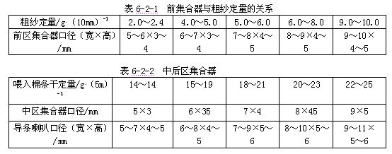 ⒌集合器口徑  集合器要求前區(qū)口徑與輸出定量相適應(yīng)、中區(qū)口徑與喂入定量相適應(yīng)。其選用可參考表6-2-1、表6-2-2。