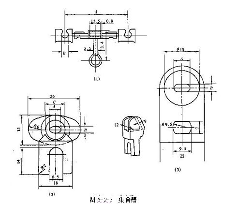 ⒈羅拉雙短皮圈牽伸裝置  三羅拉雙皮圈牽伸由三對(duì)羅拉組成兩個(gè)牽伸區(qū),在主牽伸區(qū)設(shè)置有上、下皮圈,上、下銷,隔距塊,集合器等附加元件以加強(qiáng)對(duì)纖維運(yùn)動(dòng)的控制。后牽伸區(qū)為簡(jiǎn)單羅拉牽伸或V型牽伸,起預(yù)牽伸的作用,為前區(qū)牽伸做好準(zhǔn)備。粗紗機(jī)的牽伸元件結(jié)構(gòu)、附加元件、加壓形式、清潔方式與細(xì)紗機(jī)基本相同,只是由于喂入須條較粗,所以在兩個(gè)牽伸區(qū)中均有集合器,其大小形狀與所處的牽伸區(qū)、輸出定量、喂入定量相適應(yīng),如圖6-2-3所示。前區(qū)集合器為雙錠并聯(lián)式,如圖中(1)所示,其口徑隨粗紗定量而定,見表6-2-1;中區(qū)集合器多采用上開口式,如圖中(2)所示;導(dǎo)條喇叭則為全封閉式,如圖中(3)