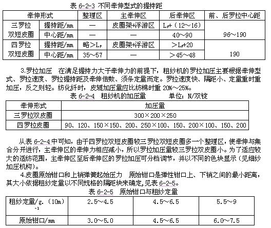 (二)牽伸工藝配置  粗紗機(jī)的牽伸工藝參數(shù)主要包括牽伸倍數(shù)及其分配、粗紗定量、羅拉握持距、羅拉加壓、原始隔距、集合器口徑等,現(xiàn)分述如下。
