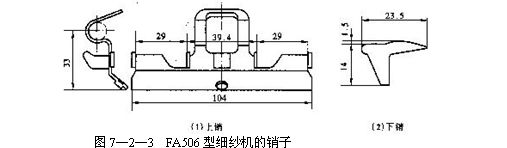 皮圈銷的作用是固定膠圈位置,把上、下膠圈引至前鉗口,并在膠圈銷處形成彈性鉗口。FA506型細(xì)紗機(jī)采用彈性擺動上銷和T形下銷,如圖7—2—3所示。下銷為6錠一根,固裝于下羅拉座上,在張力輥的彈簧作用下,與下部張力輥一起支撐下膠圈,使其呈緊張狀態(tài)。上銷為雙聯(lián)葉片狀,用于支撐上膠圈,其上端可繞小鐵輥中心靈活擺動,借助小鐵輥中心處片簧的作用給上銷施加一定的起始壓力,使上銷始終壓向下銷。上銷上裝有尼龍隔距塊,使上、下銷間保持一定的隔距,通常稱原始隔距。