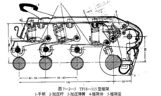 彈簧搖架加壓具有結(jié)構(gòu)緊湊、輕巧、吸震作用好、機(jī)面負(fù)荷輕且加壓大等優(yōu)點(diǎn),在新型牽伸裝置中得到了廣泛的應(yīng)用。但它的主要缺點(diǎn)是使用日久彈簧壓力有衰減現(xiàn)象,壓力穩(wěn)定性變差。如圖7—2—5所示為TF18—115型搖架結(jié)構(gòu)。