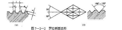 前后兩列羅拉一般為溝槽羅拉,傳動下皮圈的中羅拉為滾花羅拉。前后羅拉斷面齒形如圖7—2—2所示,圖(1)為溝槽齒形羅拉,圖(2)為滾花齒形羅拉。