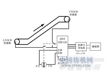 對于客用自動扶梯,一般使用高峰期出現(xiàn)在下午及晚間時段,其余時段使用率較低,具有相當(dāng)節(jié)能空間。根據(jù)以上改造原則,從投資成本及自動化水平兩方面考慮,擬使用以下變頻拖動方案:采用英威騰CHV110一體化變頻節(jié)能柜(扶梯專用)驅(qū)動電梯主機,變頻器采用多段速控制模式,并設(shè)置主頻率(低速)、多段速頻率1(高速)兩種運行頻率;