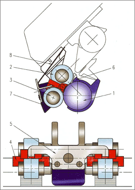 RoCoS裝置包括下羅拉1,前皮輥2,引紗皮輥3,精確的底部和裝有SUPRA磁鐵的陶瓷緊密器4,支撐梁5,導(dǎo)紗器6,上羅拉支架7,加壓彈簧8