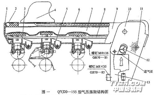 整體氣囊間接式氣動(dòng)搖架因其鎖定機(jī)構(gòu)和氣囊形式制約,造成搖架與搖架間、錠與錠間、同錠前、中、后三上羅拉間壓力相互影響,在使用中帶來(lái)錠間壓力一致性、穩(wěn)定性差,壓力調(diào)整繁 瑣等一系列的問(wèn)題。