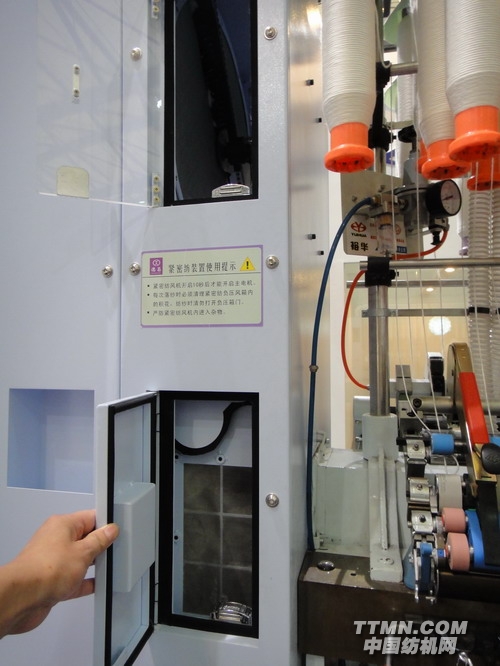 在6月14日第一天的上海紡機(jī)展上,德昌緊密紡依舊展出了三羅拉負(fù)壓式緊密紡細(xì)紗機(jī),但此緊密紡細(xì)紗機(jī)上的一項(xiàng)新技術(shù)仍舊吸引了眾多參展觀眾的眼球,那就是德昌緊密紡吸風(fēng)系統(tǒng)的改進(jìn)方案,請(qǐng)看下圖: