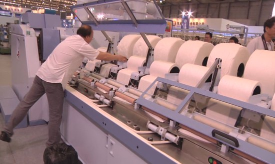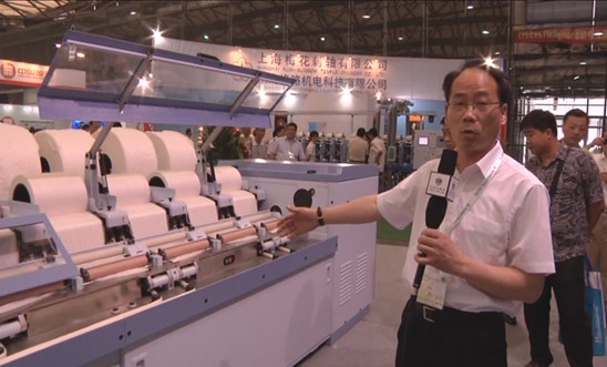 在此次展會上,這個CJ66型棉精梳機(jī)是我公司新推出的機(jī)型。我們現(xiàn)在可以看到的速度呢是450鉗次,鉗次就是每分鐘450轉(zhuǎn)。這個速度現(xiàn)在看起來其運(yùn)轉(zhuǎn)還是相當(dāng)?shù)钠椒€(wěn)。從它的棉網(wǎng)來說非常的整齊,沒有我們所謂的破邊破網(wǎng)的情況。頂梳設(shè)計上我們還是延用了原來我們的自清潔頂梳。那么從產(chǎn)品的品質(zhì)來說,該機(jī)在相應(yīng)棉花條件下,精梳紗成紗質(zhì)量可以確保在烏斯特公報的5%的水平。
