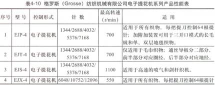 (德國)格羅斯(Grosse)紡織機(jī)械有限公司電子提花機(jī)系列產(chǎn)品性能見表4—10。