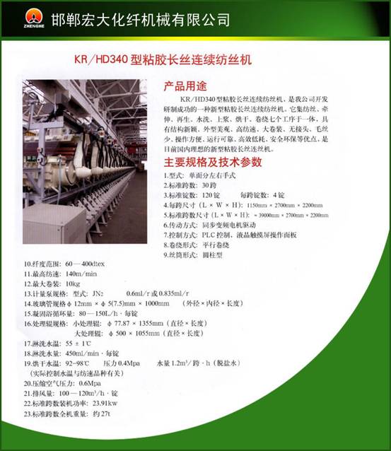 鄭州紡機(jī)邯鄲宏大化纖機(jī)械有限公司展出KR/HD340型粘膠長絲紡絲機(jī),這是該公司開發(fā)研制的一款新型粘膠長絲連續(xù)紡絲機(jī)(見圖l-12),它集紡絲、牽伸、再生、水洗、上漿、烘干、卷繞等七個工序于一體,具有高紡速、大卷裝、無接頭、毛絲少、操作方便、運行可靠、高效低耗、安全環(huán)保等優(yōu)點,是目前國內(nèi)一款比較先進(jìn)的新型粘膠長絲紡絲機(jī)。該機(jī)的技術(shù)規(guī)格見表1—30。