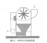·OMB打手和除雜器(圖6-3)??? 適用于任何種類、長度的纖維,尤其適用于廢紡。由二個系統(tǒng)來完成雜質(zhì)和灰塵的排除:一個足一側(cè)有用于噴射重雜質(zhì)(金屬,塑料等)的配備收集箱裝置;另一個是用于輕雜質(zhì)(植物類雜質(zhì))的由一個漏底和吸塵裝置(風機、袋支架和收集袋)組成的系統(tǒng)。該機標準工作寬度為2500mm,生產(chǎn)能力為1000-2500kg/h。