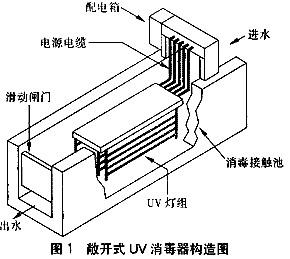 20世紀70年代以后,人們發(fā)現傳統的氯消毒會產生致畸、致癌、致突變的鹵代烷等副產物[1],而UV消毒法則具有不投加化學藥劑、不增加水的嗅和味、不產生有毒有害的副產物、消毒速度快、效率高、設備操作簡單、便于運行管理和實現自動化等優(yōu)點,近20年來逐漸得到廣泛應用。1 消毒原理 根據生物效應的不同,將紫外線按照波長劃分為四個部分:A波段(UV—A),又稱為黑斑效應紫外線(400~320nm);B波段(UV—B),又稱為紅斑效應紫外線(320~275nm);C波段(UV—C),又稱為滅菌紫外線(275~200nm);D波段(UV—D),又稱為真空紫外線(200~10nm)。水消毒主要采用的是C波段紫外線。 研究表明,紫外線主要是通過對微生物(細菌、病毒、芽孢等病原體) 的輻射損傷和破壞核酸的功能使微生物致死,從而達到消毒的目的。紫外線對核酸的作用可導致鍵和鏈的斷裂、股間交聯和形成光化產物等[2],從而改變了DNA的生物活性,使微生物自身不能復制,這種紫外線損傷也是致死性損傷。2 UV消毒器的結構形式 UV消毒器按水流邊界的不同分為敞開式和封閉式。?2.1 敞開式系統 在敞開式UV消毒器中被消毒的水在重力作用下流經UV消毒器并滅活水中的微生物。敞開式系統又可分為浸沒式和水面式兩種。