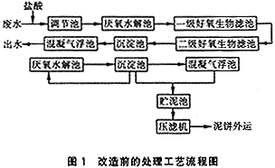 改造的主要構(gòu)筑物及設(shè)備: ① 調(diào)節(jié)池。設(shè)計(jì)原水調(diào)節(jié)池有效停留時(shí)間為8 h,整個(gè)調(diào)節(jié)池尺寸為20m×10m×2.5m ,內(nèi)分6格。在原水進(jìn)調(diào)節(jié)池前有一小渠道,在渠道中投硫酸亞鐵,使pH為7~9左右。廢水在調(diào)節(jié)池內(nèi)有一初沉?xí)r間,對(duì)池底污泥,紡織廠每年趁春節(jié)放假之際清掏外運(yùn)。 ② 厭氧水解池。呈長(zhǎng)方形,尺寸為10m×7.5m×5m,有效停留時(shí)間10h。分為兩組 ,每組都有一個(gè)脈沖布水器,其對(duì)水解池內(nèi)的配水是間歇式的,對(duì)厭氧池則起攪拌、沖刷作用。厭氧池內(nèi)的污水分污泥層、附著層、清水區(qū)。攪拌是為了防止死水、短流,沖刷能防止附著層阻塞,厭氧池內(nèi)設(shè)有斜板附著層,厭氧水解池是穿孔集水槽配水。 ③ 接觸氧化池。在原生物濾池的位置上建造,外型尺寸:20m×15m×4.5m,采用三廊道 ,內(nèi)懸掛半軟性填料(厚3m),填料接觸時(shí)間20h,底部裝有微孔曝氣頭,氣水比為15∶1, 經(jīng)測(cè)試池內(nèi)溶解氧濃度為3.8mg/L。 ④ 沉淀池。為豎流式、方形,尺寸為6 m×5 m×5 m,從池頂中心進(jìn)水,出水經(jīng)鋸齒形集 水槽。豎流式沉淀池主要是沉淀接觸氧化池脫落的生物膜,出水進(jìn)入混凝氣浮池。 沉淀污泥全部回流至厭氧水解池,補(bǔ)充營(yíng)養(yǎng),原設(shè)計(jì)進(jìn)入貯泥池的排泥管保留。 ⑤ 混凝氣浮池。進(jìn)一步去除在沉淀池中不能下沉去除的細(xì)小顆粒,投加凈水劑,凈水劑是