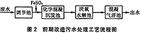 2.1 前期改造 捷德紡織廠采取邊改造邊生產(chǎn)的方式進(jìn)行。由于二級(jí)生物濾池對(duì)有機(jī)物的降解率只有30%~4 0%,且滋生蚊蠅,決定利用現(xiàn)有的厭氧水解池,打掉二級(jí)生物濾池,改成生物接觸氧化池。 但厭氧水解池對(duì)COD的去除率僅有10%~20%,大量負(fù)荷會(huì)帶給后續(xù)處理構(gòu)筑物,為減少生化改造期間的污染,在厭氧水解池前加一套物化處理設(shè)備(即化學(xué)混凝沉淀),以降低負(fù)荷。 前期改造的工藝流程見(jiàn)圖2。