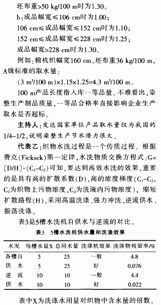 主持人:歡迎進(jìn)入《百花苑》水是人類生存無可替代的有限自然資源.全球可用水告急.而我國人均可用水量僅為世界人均可用水的1/3.是一個(gè)缺水的國家 國家“十一五”規(guī)劃有關(guān)經(jīng)濟(jì)社會(huì)發(fā)展的主要指標(biāo)中.要求單位工業(yè)增加值用水量要降低30% 江蘇省也要求到2010年萬元GDP水耗降到250噸 工業(yè)用水重復(fù)利用率提高g170% 這都說明國家已很重視水資源的應(yīng)用 紡織工業(yè)已被國家發(fā)改委和水利部列為五大耗水工業(yè)部門之一 一個(gè)染整大廠用水量年需要400~500萬噸.其中生產(chǎn)用水量重復(fù)利用率僅為5%~8% ,離目前先進(jìn)的重復(fù)利用率30%甚遠(yuǎn).全國棉及棉混紡織物的染整產(chǎn)品平均取水量已超過5 t/lO0 m.節(jié)約染整生產(chǎn)用水已成燃眉之急 下面就一次染整節(jié)能會(huì)議上有關(guān)代表在節(jié)水方面的經(jīng)驗(yàn)交流如下:代表甲:企業(yè)的用水是否正常,應(yīng)按國家標(biāo)準(zhǔn)考核 國標(biāo)取水定額GB/T 189164—2002中規(guī)定:計(jì)算基準(zhǔn)棉印染產(chǎn)品為棉機(jī)織印染布.幅寬平均為106 em,布重11 k 100 m的合格產(chǎn)品。取水量分A、B兩級(jí).1998年7月1 El后建成的新擴(kuò)改企業(yè)或生產(chǎn)線執(zhí)行A級(jí);1998年7月1 El前的企業(yè)執(zhí)行B級(jí)。