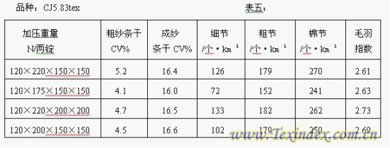 在滿足握持力大于牽伸力的情況下,粗紗機(jī)的羅拉加壓主要根據(jù)牽伸形式、羅拉速度、羅拉握持距、牽伸倍數(shù)、熟條定量及膠輥狀態(tài)而定,羅拉速度慢,隔距大,定量輕、膠輥硬度低、彈性好時(shí)加壓輕,反之則重。牽伸區(qū)有集合器重加壓,主牽伸區(qū)無集合器的四上四下D型牽伸羅拉加壓可略輕。結(jié)合緒森板簧搖架的性能,確定四種加壓分配進(jìn)行試驗(yàn)優(yōu)選,結(jié)果見表五: