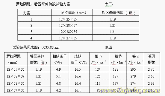 為了合理優(yōu)選出最佳粗紗工藝參數(shù),以提高CJ5.83tex成紗質(zhì)量。我們根據(jù)確定的試驗(yàn)條件,對FA497粗紗的總牽伸倍數(shù)、主牽伸區(qū)和后區(qū)的羅拉隔距、后區(qū)牽伸倍數(shù)、加壓重量及鉗口隔距進(jìn)行工藝優(yōu)選試驗(yàn).