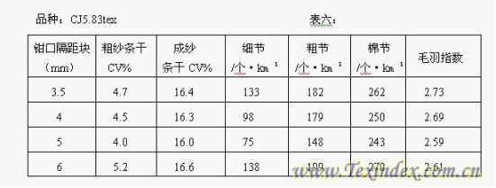 粗紗鉗口隔距,根據(jù)粗紗定量及主牽伸倍數(shù)而定,定量輕而主牽伸倍數(shù)較低時(shí),膠圈鉗口內(nèi)通過的纖維量大,鉗口應(yīng)偏大掌握,反之偏小掌握。不同粗紗鉗口隔距優(yōu)選試驗(yàn)及結(jié)果見表六。