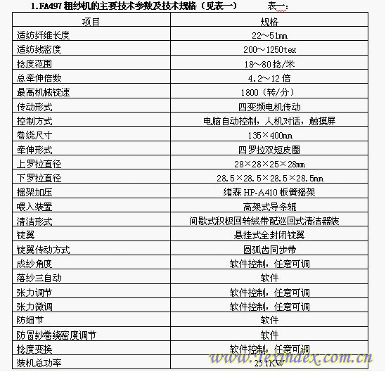 FA497粗紗機(jī)是中意合資·賽特環(huán)球機(jī)械有限公司生產(chǎn)的新型高速懸錠電腦粗紗機(jī),它采用先進(jìn)的電腦控制技術(shù),取掉了原有粗紗機(jī)的鐵炮變速機(jī)構(gòu)、機(jī)械成形機(jī)構(gòu),采用進(jìn)口變頻器,實(shí)現(xiàn)無極變速。四個(gè)變頻電機(jī)分別驅(qū)動(dòng)錠翼、羅拉、卷繞、升降系統(tǒng),運(yùn)用成熟的計(jì)算機(jī)控制技術(shù),實(shí)現(xiàn)了四大運(yùn)動(dòng)系統(tǒng)的同步匹配;配備懸掛式全封閉高速錠翼,最高機(jī)械錠速達(dá)1800轉(zhuǎn)/分,是目前國內(nèi)較先進(jìn)的高速懸錠電腦粗紗機(jī)。