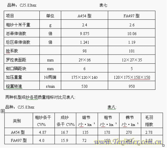 FA497粗紗機(jī)的總牽伸倍數(shù)、后區(qū)牽伸倍數(shù)、羅拉隔距、搖架加壓重量、前區(qū)鉗口隔距等各項(xiàng)工藝參數(shù)經(jīng)過優(yōu)選后,CJ5.83tex紡紗質(zhì)量的到明顯提高,表七為與原A454粗紗機(jī)工藝比較。
