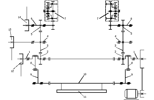 傳統(tǒng)的噴氣織機(jī)的傳動(dòng)系統(tǒng)如圖11-2所示。主電動(dòng)機(jī)通過組合型三角皮帶傳動(dòng)織機(jī)主軸1,由主軸通過主軸齒輪2及中心軸齒輪3傳動(dòng)中心軸4,再由中心軸齒輪3和絞邊軸齒輪5傳動(dòng)絞邊軸6。主軸與中心軸的轉(zhuǎn)速比為2:1,與絞邊軸的轉(zhuǎn)速比為1:1。窄幅噴氣織機(jī)通常通過四連桿裝置驅(qū)動(dòng)打緯機(jī)構(gòu),主軸通過連桿機(jī)構(gòu)的牽手8使擺臂(筘座腳)9往復(fù)擺動(dòng),帶動(dòng)鋼筘打緯。同時(shí),由絞邊軸傳動(dòng)絞邊機(jī)構(gòu)7,并通過三角皮帶輪14傳動(dòng)送經(jīng)機(jī)構(gòu)。另外主軸通過齒型帶輪