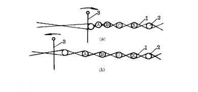 在打緯開(kāi)始以后,打緯作用波及織口,隨著鋼筘繼續(xù)向機(jī)前方向移動(dòng),織口將被推向前方,同時(shí)新緯紗在鋼筘的打擊下,將壓力傳給相鄰的緯紗。如圖9-8(a)所示,使織口處原第一根緯紗A向第二根緯紗B靠近,而第二根又向第三根緯紗C靠近,如此等等,相對(duì)于經(jīng)紗略做移動(dòng)。與此同時(shí),經(jīng)緯紗線間產(chǎn)生急劇的摩擦和屈曲作用,當(dāng)鋼筘到達(dá)最前方位置時(shí),這些作用最為劇烈,因而產(chǎn)生最大的阻力,這個(gè)最大的阻力稱為打緯阻力。此刻,鋼筘對(duì)緯紗的作用力也達(dá)到最大,稱為打緯力。打緯力與打緯阻力是一對(duì)作用力與反作用力。