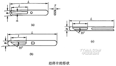 經(jīng)停片是織機(jī)經(jīng)停裝置的傳感元件,當(dāng)經(jīng)紗斷頭時(shí),經(jīng)停片下落,通過(guò)機(jī)械檢測(cè)機(jī)構(gòu)或電氣檢測(cè)機(jī)構(gòu),發(fā)動(dòng)織機(jī)迅速停車(chē)。經(jīng)停片由鋼片制成,外形如下頁(yè)圖所示,圖中(a)為機(jī)械式經(jīng)停裝置的經(jīng)停片,(b)、(c)為電氣式經(jīng)停裝置的經(jīng)停片。