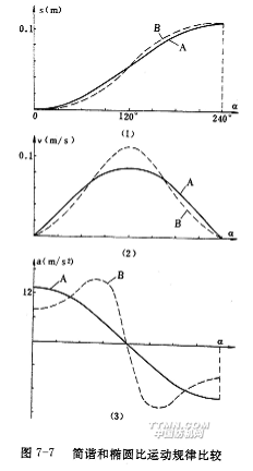 一個(gè)動(dòng)點(diǎn)在橢圓上繞中心作等角速度轉(zhuǎn)動(dòng)時(shí),此點(diǎn)在橢圓短軸上的投影點(diǎn)的運(yùn)動(dòng)即為橢圓比運(yùn)動(dòng)規(guī)律。當(dāng)橢圓的長、短半軸之比為1時(shí),即為簡諧運(yùn)動(dòng)規(guī)律。橢圓的長、短半軸之比的大小對(duì)綜框運(yùn)動(dòng)加速度變化幅度影響很大,一般此比值取1.2~1.3。若sx、ω和αy取值同前,上述比值為1.2008時(shí),綜框加速度最大值與簡諧運(yùn)動(dòng)規(guī)律相同,但綜框從靜止到運(yùn)動(dòng)和從運(yùn)動(dòng)到靜止之間過渡時(shí)的加速度值比簡諧運(yùn)動(dòng)規(guī)律?。槐戎荡笥?.2008時(shí),綜框加速度最大值超過簡諧運(yùn)動(dòng)規(guī)律,而綜框從靜止到運(yùn)動(dòng)和從運(yùn)動(dòng)到靜止之間過渡時(shí)的加速度值變得更小。圖7-7中曲線B分別是橢圓比運(yùn)動(dòng)規(guī)律的位移、速度、加速度的曲線,與簡諧運(yùn)動(dòng)規(guī)律相比,在綜平前后經(jīng)紗張力小時(shí),橢圓比運(yùn)動(dòng)規(guī)律的綜框運(yùn)動(dòng)速度更快,更有利于開清梭口;在閉口開始后的一個(gè)時(shí)期,綜框運(yùn)動(dòng)更緩慢,更有利于梭子飛出梭口;綜框從靜止到運(yùn)動(dòng)和從運(yùn)動(dòng)到靜止之間過渡時(shí)的