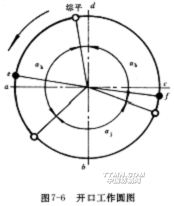 經(jīng)紗從離開綜平位置,上下分開,到重新返回這個(gè)位置就完成一次開口。在開口過程中,上下交替的經(jīng)紗達(dá)到綜平位置的時(shí)刻,即梭口開啟的瞬間,稱為開口時(shí)間,俗稱綜平時(shí)間,它是重要的工藝參數(shù)。通常,標(biāo)注有織機(jī)主要機(jī)構(gòu)運(yùn)動(dòng)時(shí)間參數(shù)的主軸圓周圖稱為織機(jī)工作圓圖,用以表示織機(jī)運(yùn)動(dòng)時(shí)間的配合關(guān)系,如圖7-6所示。圖中箭頭表示主軸回轉(zhuǎn)的方向,除個(gè)別情況外,主軸總是按逆時(shí)針方向回轉(zhuǎn)。圓周圖的前方、下方、后方和上方四個(gè)特征位置(記為a、b、c、d)分別稱為前心、下心、后心和上心。擺動(dòng)筘座到達(dá)最前和最后位置e、f時(shí),主軸所在的位置分別稱為前止點(diǎn)(前死心)和后止點(diǎn)(后死心)。前止點(diǎn)的主軸位置角為0°,作為度量基準(zhǔn)。圖中開口時(shí)間的長短用開口角αk表示,靜止時(shí)間的長短用靜止角αj表示,閉口時(shí)期的長短用閉口角αb表示。在閉合和開口時(shí)期內(nèi),綜框處于運(yùn)動(dòng)狀態(tài)之中,所以αb+αk便是綜框運(yùn)動(dòng)角。應(yīng)該指出,織機(jī)主要機(jī)構(gòu)運(yùn)動(dòng)時(shí)間的配合關(guān)系有時(shí)也用周期圖表示。