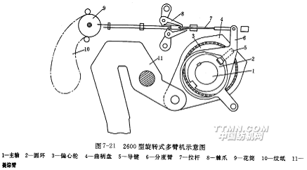 為了適應織機高速化需要,國外70年代發(fā)明了回轉(zhuǎn)偏心輪式多臂開口機構(gòu),并于80年代中期投入使用。回轉(zhuǎn)多臂開口機構(gòu)采取回轉(zhuǎn)變速裝