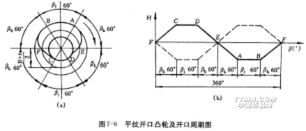 圖7-9(a)是平紋凸輪,它的外緣輪廓由若干段弧線所圍成,這些弧線分別對應開口、靜止和閉合三個階段。其中大半徑圓弧線AB和小半徑圓弧線CD對應綜框(經(jīng)紗)在下方和上方形成開口過程中的靜止階段,稱為靜止弧線;連接大、小半徑圓弧的弧線AD和BC使綜框(經(jīng)紗)由上方位置過渡到下方位置和由下方位置過渡到上方位置,前者稱下降弧線,后者稱上升弧線。在下降弧線和上升弧線上必有兩點E和F,在這里,運動綜框上下平齊,處于綜平位置。這就表明,凸輪每一回轉(zhuǎn),受它控制的一組經(jīng)紗便依次經(jīng)歷上方靜止(CD弧線)、閉合(DE弧線)、綜平(E)、開口(EA弧線)、下方靜上(AB弧線)、閉合(BF弧線)、綜平(F)、開口(FC弧線)、又回到上方靜止的變化,完成兩次開口動作。用開口周期圖表示,如圖7-9(b)中的實線所示。受另一凸輪控制的另一組經(jīng)紗的運動情況如圖中的虛線所示。