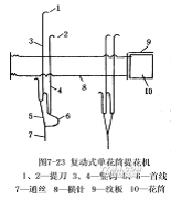 圖7-23為復動式單花筒提花開口示意圖,相間排列的兩組提刀1、2,分別裝在兩只刀架上??棛C主軸回轉(zhuǎn)兩轉(zhuǎn),兩組提刀交替升降一次,控制相應的豎鉤3、4升降。豎鉤的數(shù)目是相同容量單動式提花開口機構(gòu)的兩倍。每根通絲7由兩根豎鉤通過首線5、6控制,而這兩根豎鉤受同一根橫針8的控制。因此,兩只刀架的上升都可使通絲獲得上升運動,并能連續(xù)上升任何次數(shù)。如上次開口豎鉤3上升,豎鉤4在下方維持不動,則豎鉤3下方的首線和全部通絲將隨著豎鉤3上升;若下次開口中這組通絲仍需上升,則豎鉤3下降而豎鉤4上升,約在平綜位置相遇,繼續(xù)運動時首線和通絲即隨豎鉤4再次上升,豎鉤3下面的首線將呈松弛狀態(tài),所以形成的是半開梭口。
