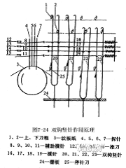 如圖7-24所示,1、2為交替運動的上、下刀箱,與刀箱相配的雙鉤豎針20、21、22、23直立在柵板24上,與控制雙鉤豎針的橫針16、17、18、19上的兩彎頭相配。橫針后端由彈簧作用使豎針復位,在橫針的前端有輔助橫針8、9、10、11,分別與探針4、5、6、7對應,12、13、14、15為橫針推刀箱的推刀。織機主軸一轉(zhuǎn),紋板紙3便沿著花筒上的箭頭方向轉(zhuǎn)過一塊