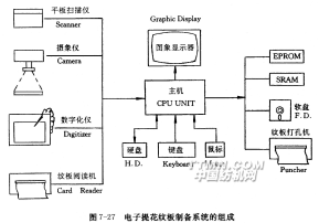 圖7-27是電子提花的花型設計和紋板制備系統(tǒng)的框圖,由圖案輸入、處理和紋板數(shù)據(jù)輸出等三部分組成。由于提花圖案較為復雜,系統(tǒng)提供了四種輸入手段。如果圖案原稿是彩圖、意匠圖和投影放大圖等紙