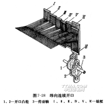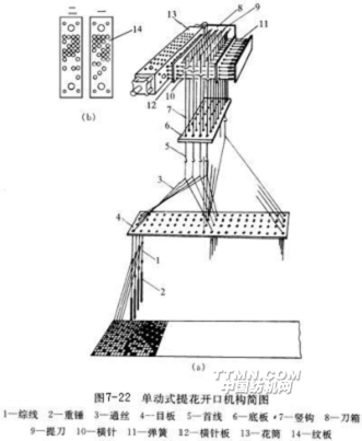 圖7-22是單動式提花開口的簡圖。所謂單動式是指提花開口機構(gòu)的刀箱8在主軸一回轉(zhuǎn)內(nèi),上、下往復運動一次,形成一次梭口。