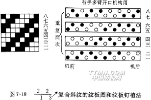 紋板制備是指根據(jù)紋板圖的要求在紋板上植紋釘?shù)牟僮鳌D7-18是復合斜紋的紋板圖和紋板釘植法。圖中黑點表示植有紋釘,圓圈表示不植紋釘?shù)目籽?。雖用四塊紋塊即可織造,但因紋板總數(shù)至少需8塊,故要重復一個緯紗循環(huán)數(shù)。