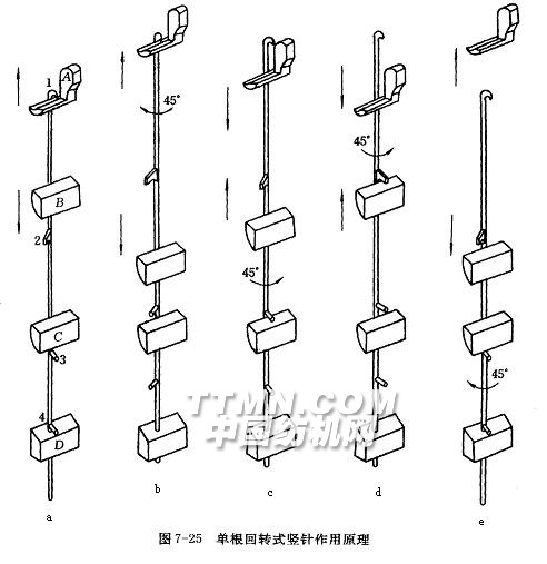 圖7-25所示為提花開口機構(gòu)的回轉(zhuǎn)豎針結(jié)構(gòu),與其它結(jié)構(gòu)的豎針相比,這種回轉(zhuǎn)豎針工作過程中不產(chǎn)生震動,承載能力較大,可以適應高速運轉(zhuǎn)。每根回轉(zhuǎn)豎針上有4個鉤(1、2、3、4),停針鉤3與底鉤4同向,上鉤1相對底鉤4向右成45º而下鉤2則向左成45º?;剞D(zhuǎn)豎針的工作過程分為五個階段。圖7-25(a)表示回轉(zhuǎn)豎針的底鉤貼在底板D上,豎針位于最低位置,經(jīng)紗位于梭口下層,上提刀A和下提刀B分別做上、下移動;圖7-25(b)表示豎針順時針方向轉(zhuǎn)過45º,上鉤1與上升的上提刀A相垂直而被提升,同時,下鉤2也同方向轉(zhuǎn)過45º而避開了下提刀B下降,此時經(jīng)紗位于梭口的上層;圖7-25(c)表示上提刀A下降,豎針逆時針方向轉(zhuǎn)過45º,停計鉤3停在停針刀C上,豎針隨上提刀略有下降;圖7-25(d)表示豎針繼續(xù)逆時針方向回轉(zhuǎn)45º,下鉤2與上升