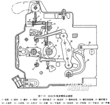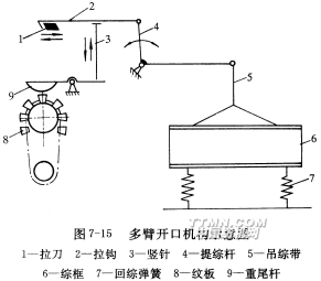 最簡單的多臂開口機構(gòu)如圖2-14所示。拉刀1由織機主軸上的連桿或凸輪傳動,作水平方向的往復運動。拉鉤2通過提綜桿4、吊綜帶5同綜框6連接。由紋板8、重尾桿9控制的豎針3按照紋板圖所規(guī)定的順序上下運動,以決定拉鉤是否為拉刀所拉動,從而決定與該拉鉤連接的綜框是否被提起。7為回綜彈簧。