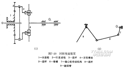 圖7-20是回轉(zhuǎn)變速裝置的示意圖。大齒輪1固定不動,短軸O由織機側(cè)軸通過鏈輪、鏈條傳動,作勻速回轉(zhuǎn)運動。短軸O帶動連桿5(實際上為一圓盤)通過連桿3使一對行星齒輪2環(huán)繞大齒輪1旋轉(zhuǎn)。行星齒輪2固裝在連桿3一端,連桿另一端與方形滑塊4相連,方形滑塊嵌在滑槽6內(nèi),滑槽6又與多臂機主軸O1連成一體。在主軸O1上固裝有偏心輪傳動機構(gòu)7,通過連桿8傳動提綜臂9。當織機運轉(zhuǎn)時,通過上述機構(gòu)使綜框作變速往復運動。該變速運動是行星輪運動與滑塊機構(gòu)運動復合的結(jié)果,可獲得織機主軸轉(zhuǎn)角100º左右的近似靜止角。