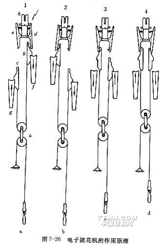 電子提花開口中廢除了機械式紋板和橫針等控制裝置,而用電磁鐵來控制首線的上下位置。圖7-26為以一根首線為提綜單元的電子提花機開口的工作原理示意圖。提刀g、f受織機主軸傳動而作速度相等、方向相反的上下往復運動,并分別帶動用繩子通過雙滑輪a連在一起的提綜鉤c、b作升降運動。如上一次開口結(jié)束時提綜鉤b在最高位置時被保持鉤d鉤住,提綜鉤c在最低位,首線在低位,相應的經(jīng)紗形成梭口下層。此時,若織物交織規(guī)律要求首線維持低位,電磁鐵h得電,保持鉤d被吸合而脫開提綜鉤b,提綜鉤b隨提刀f下降,提刀g帶著提綜鉤c上升,相應的經(jīng)紗仍留在梭口下層,如圖7-26(a)所示;圖7-26(b)表示提刀g帶著提綜鉤c上升到最高處,提刀f帶著提綜鉤b下到最低處,首線仍在低位;圖7-26(c)表示電磁鐵b不得電,提綜鉤c上升到最高處并被保持鉤e鉤住,提刀f帶著提綜鉤b上升,首線被提升;圖7-26(d)表示提綜鉤b被升至保持鉤d處時,電磁鐵h不得電,保持鉤d鉤住提綜鉤b,使首線升至高位,相應的經(jīng)紗到梭口上層位置。由于提綜單元中運動件極少,由這種提綜單元組成的提花開口機構(gòu)最高可響應1000r/min的織機轉(zhuǎn)速,這是目前最為先進的設計。