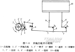 共軛凸輪開口機構(gòu)利用雙凸輪積極地控制綜框的升降運動,不需吊綜裝置。其傳動過程見圖7-12。由圖可見,凸輪2從小半徑轉(zhuǎn)至大半徑時(此時凸輪2′從大半徑轉(zhuǎn)至小半徑)推動綜框下降,凸輪2′從小半徑轉(zhuǎn)至大半徑時(此時凸輪2從大半徑轉(zhuǎn)至小半徑)推動綜框上升,兩只凸輪依次輪流工作,因此綜框的升降運動都是積極的。由于共軛凸輪裝于織機外側(cè),能充分利用空間,可以適當加大凸輪基圓直徑和縮小凸輪大小半徑之差,達到減小凸輪壓力角的目的。此外,共軛凸輪開口機構(gòu)從擺桿一直到提綜桿都是剛性連接,因此綜框運動更為穩(wěn)定和準確。